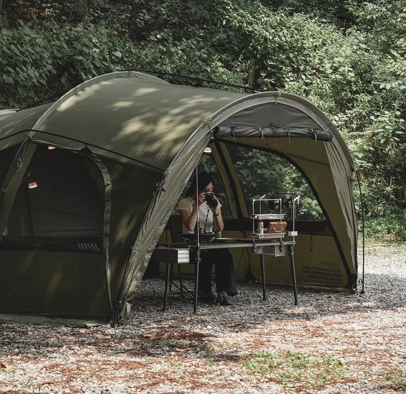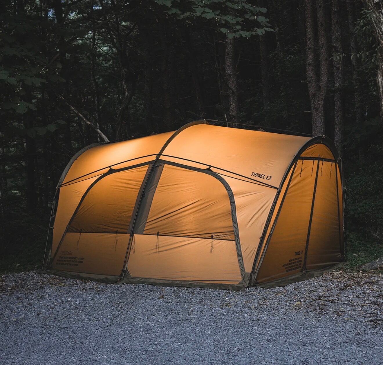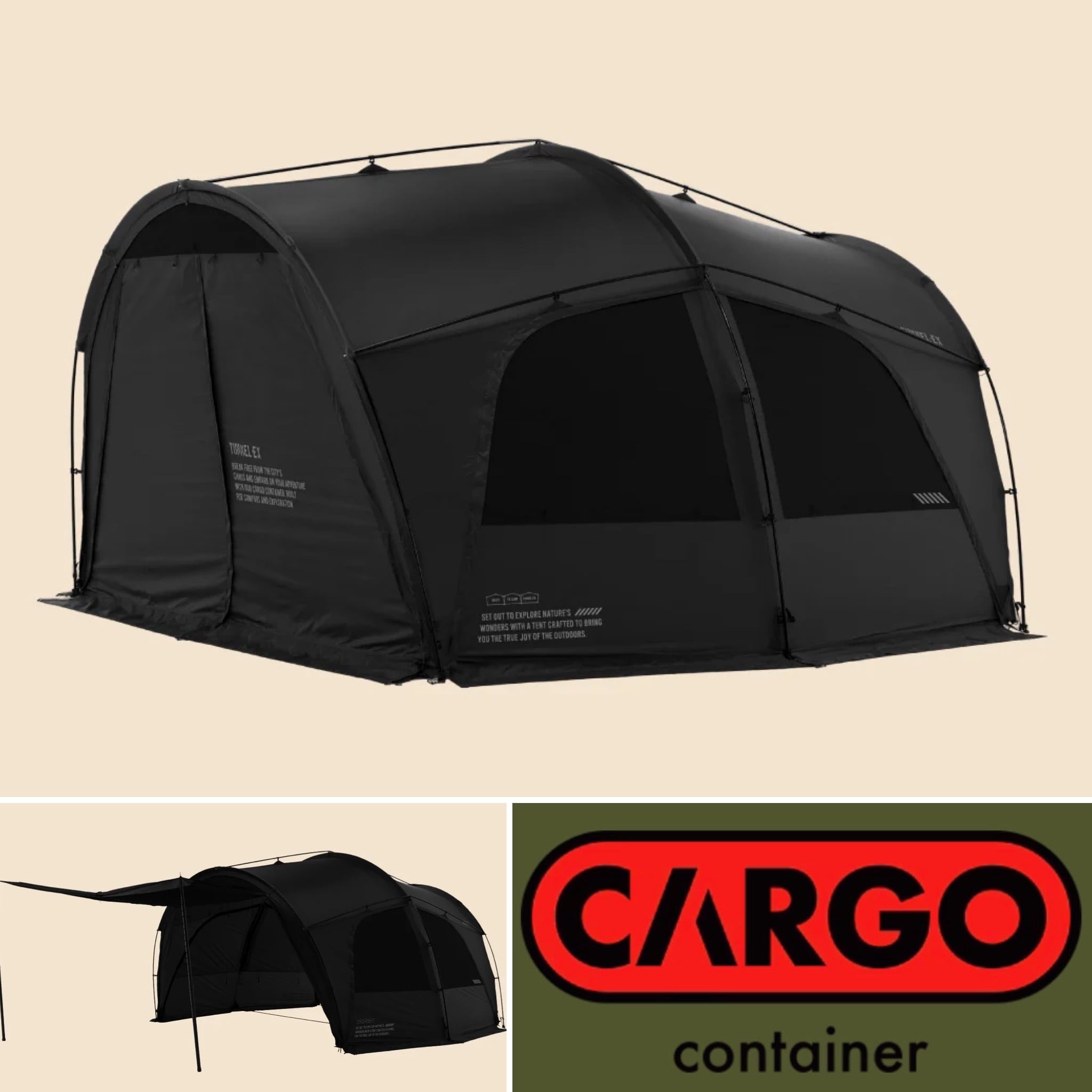 TUNNEL-EXは、CARGO CONTAINERとDACが共同で開発した2番目の作品であり、ドームテントの安定感とトンネルテントの開放感を兼ね備えたハイブリッド構造のプレミアムシェルターです。