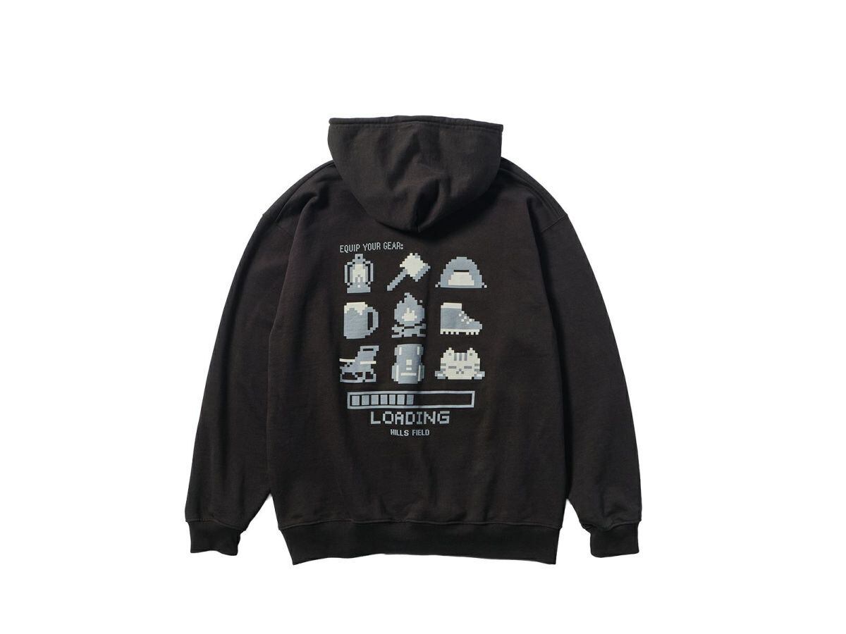 平成レトロなゲーム画面を彷彿とさせる、『キャンプ装備ロード中』のバックプリントが目を引くフーディ。