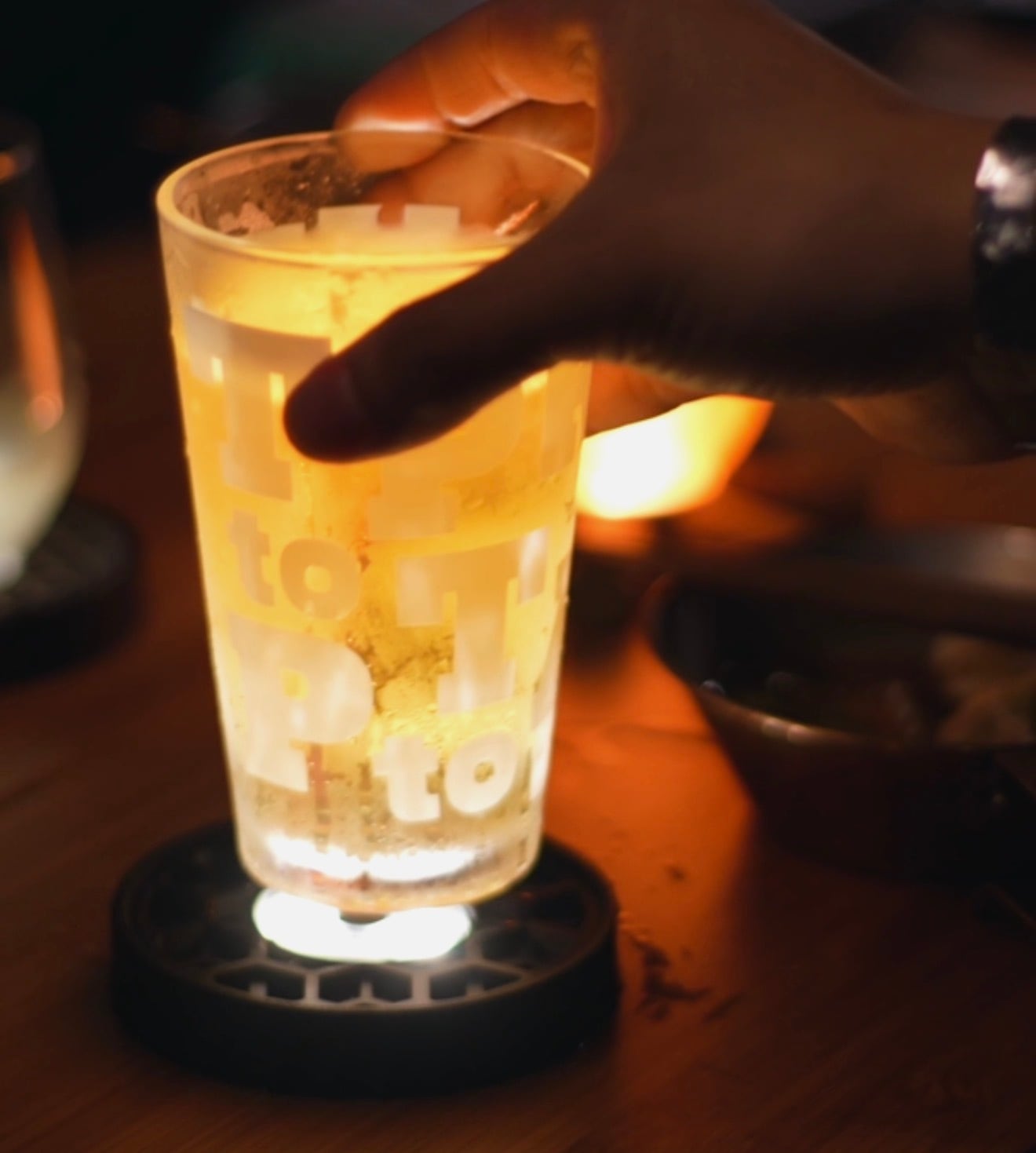 マグネットライトを装着する事で光を灯すことの出来るコースター。