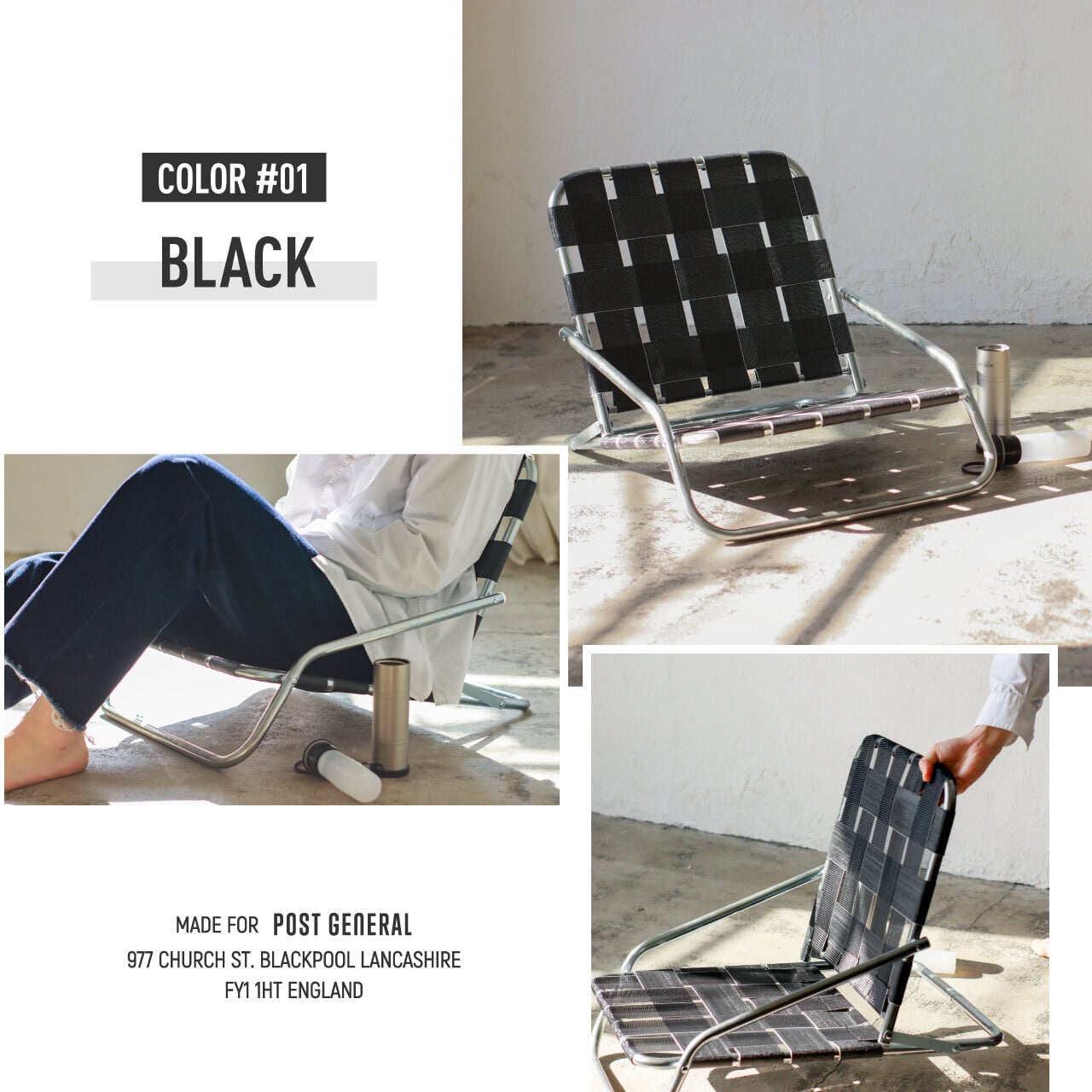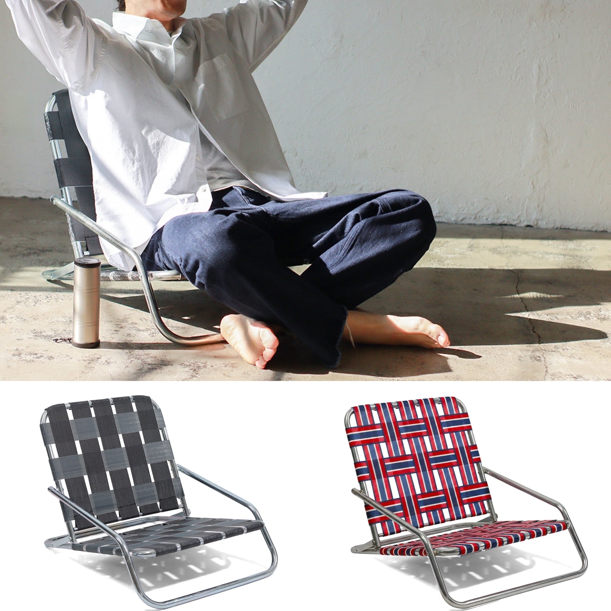 亜鉛メッキ仕上げのインダストリアル感漂うフレームに、レトロなテープを合わせた極ロー型のフォールディングチェア。