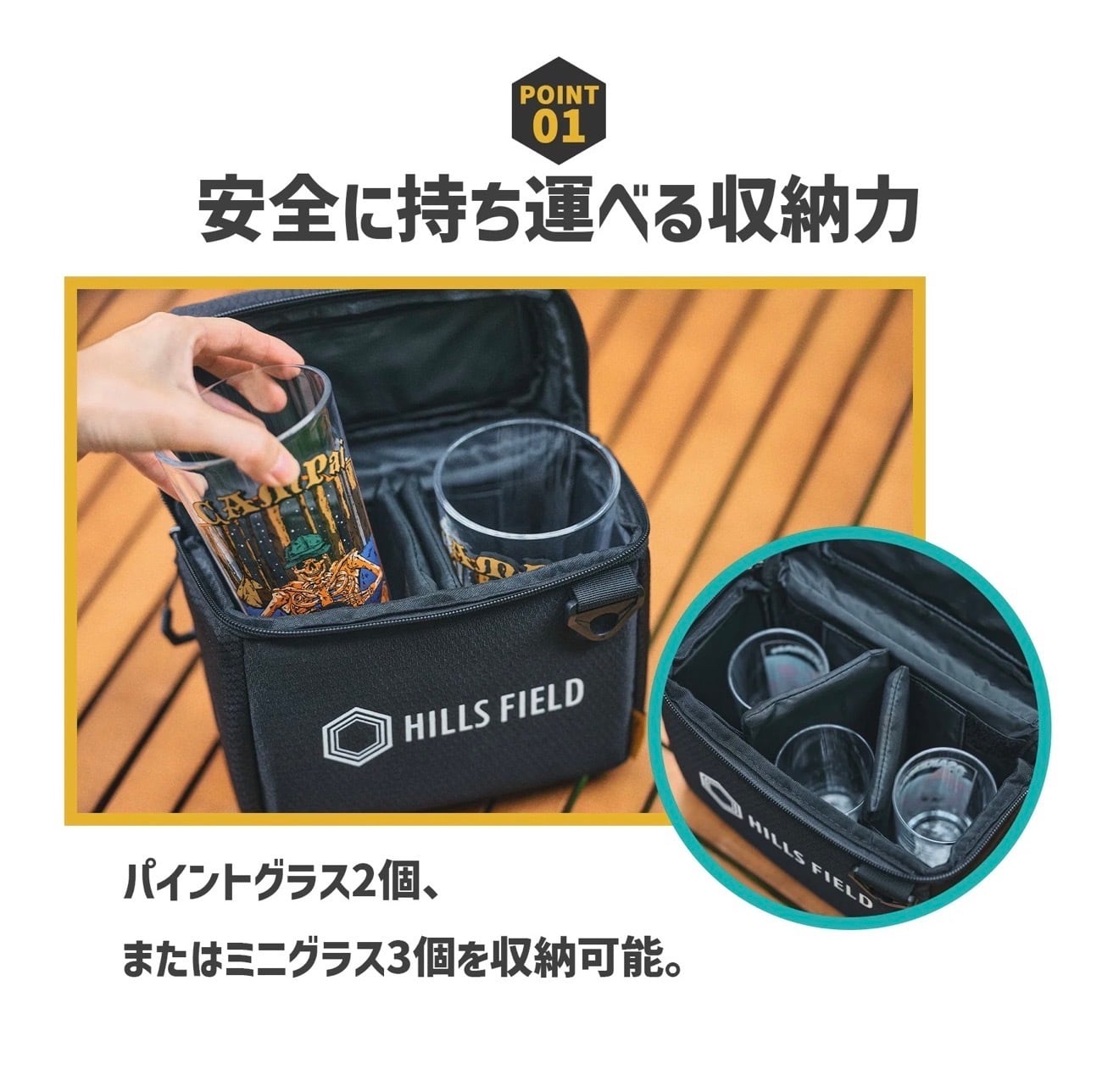 パイントグラスを2個、またはミニグラスを3個収納できるケースとなります。